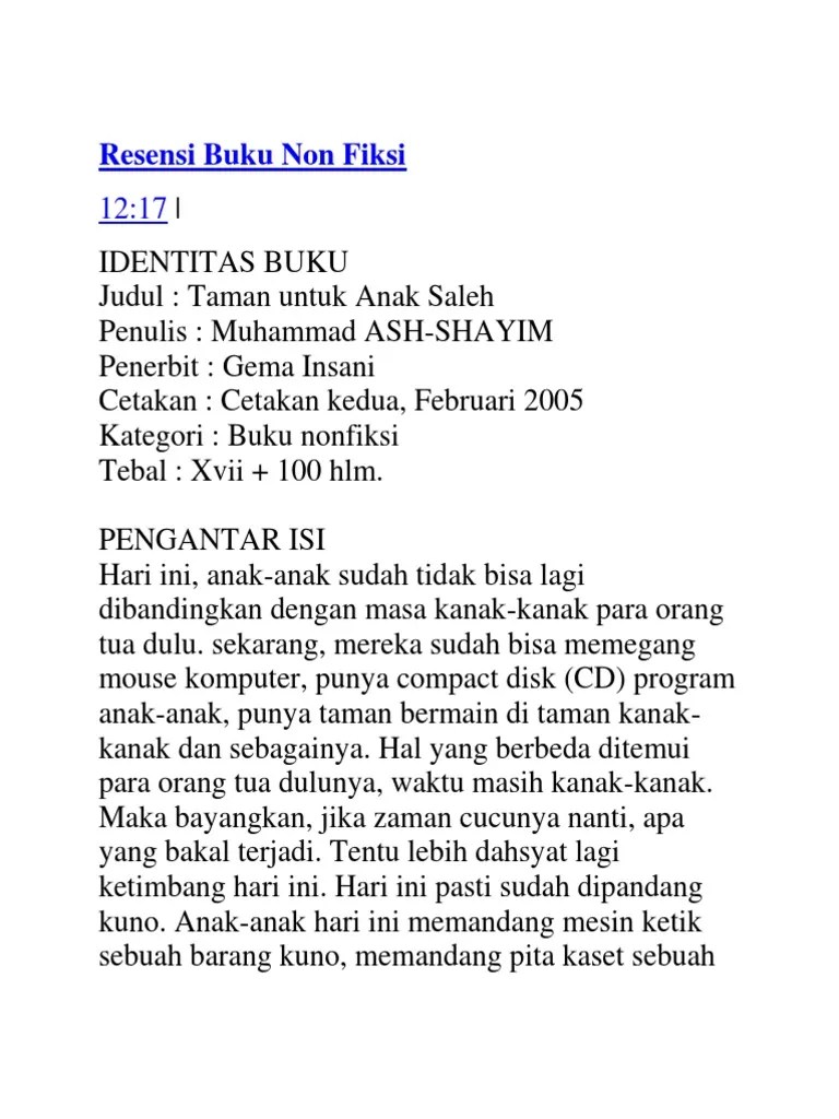 Membaca naskah asli bacalah naskah asli sekali atau dua kali, kalau perlu berulang kali agar anda . Identitas bukujudul buku :buku sakti menulis . Kedua kategori tersebut ialah buku fiksi dan . Kiamat surga & neraka uraian tuntas diseputar kiamat sebagai bahan cerminan dan renungan bagi orang yang lupa rama… Menelaah unsur buku dan membuat komentar 282. 7/31/2019 merangkum buku non fiksi 1/5merangkum buku non fiksitugas bahasa indonesiamerangkum buku non fiksi1. Contoh resensi buku non fiksi terbaik ada banyak sekali seperti novel, ilmu pengetehuan, motivasi, komputer, pendidikan. Bacalah daftar isi · 4. Baca sampul belakang buku · 3. Mengamati contoh komentar terhadap buku fiksi dan nonfiksi 283. Cara meringkas buku non fiksi/novel · 1. Perbedaan dari rangkuman dan ringkasan adalah: Sinopsis salah satu gambaran lebih spesifik dan memuat unsur konflik (pada novel) dan unsur selling point (pada buku nonfiksi).