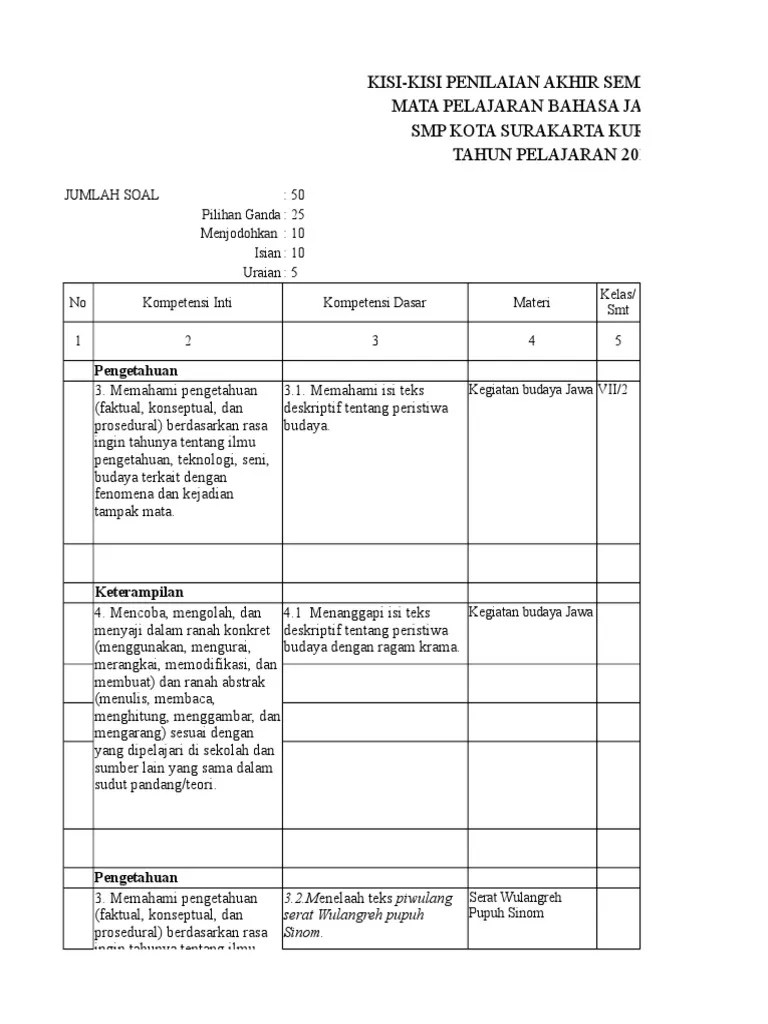 Smp kelas vii/ semester 1 alokasi waktu : Senin, 10 maret 2015 waktu : Bahasa jawa smpn 5 kediri. Pada kesempatan kali ini akan kami bagikan contoh latihan soal uts / ulangan tengah semester 1 (ganjil) kelas 7 / vii smp / mts mapel bahasa jawa. Ulangan harian 1 bahasa jawa, kelas 7, semester gasal a.